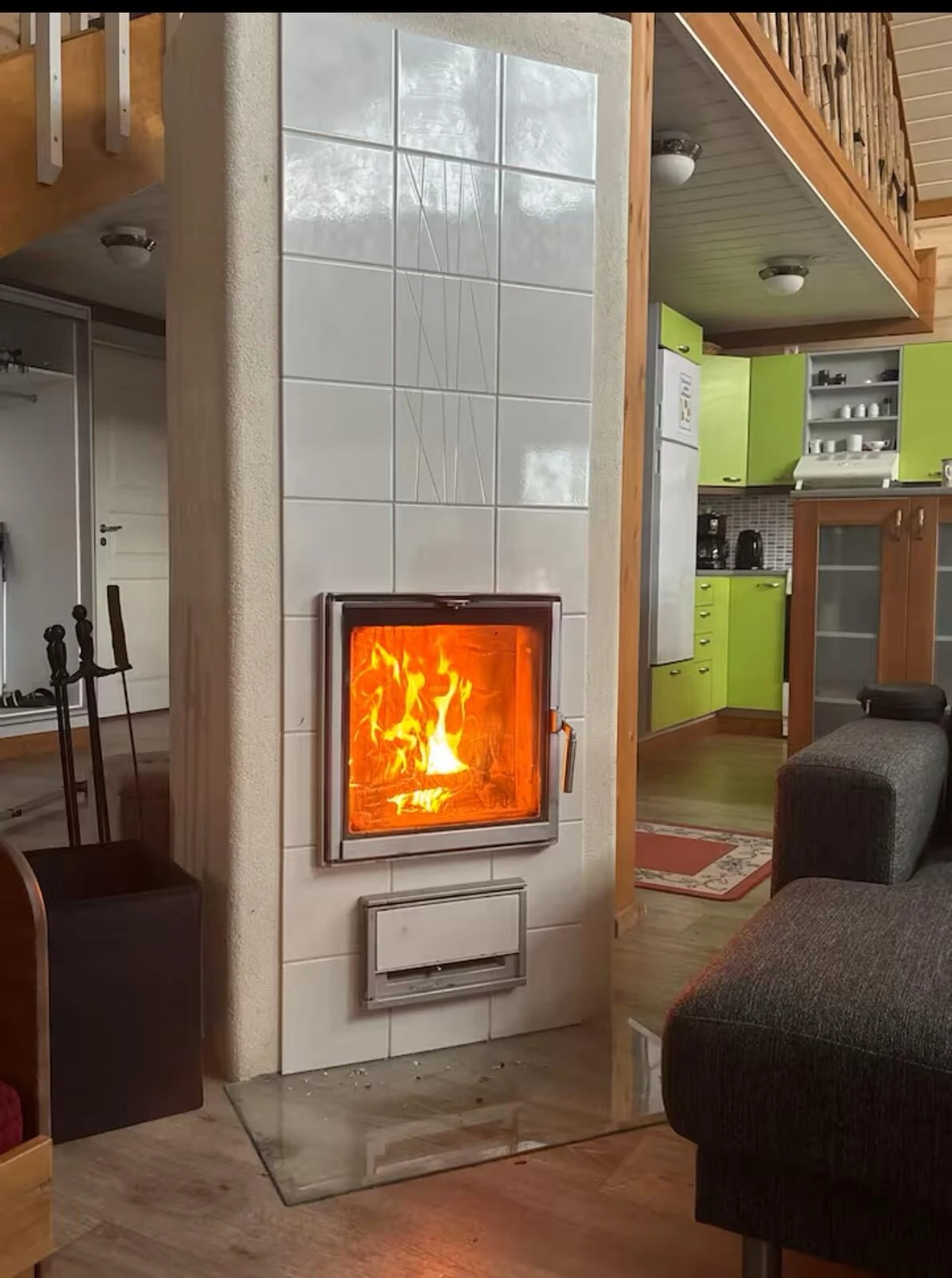 Yläkerrassa on makuuhuone sekä parvi, josta avautuu suora näkymä louhosjärvelle ja Viihdekeskukseen.
